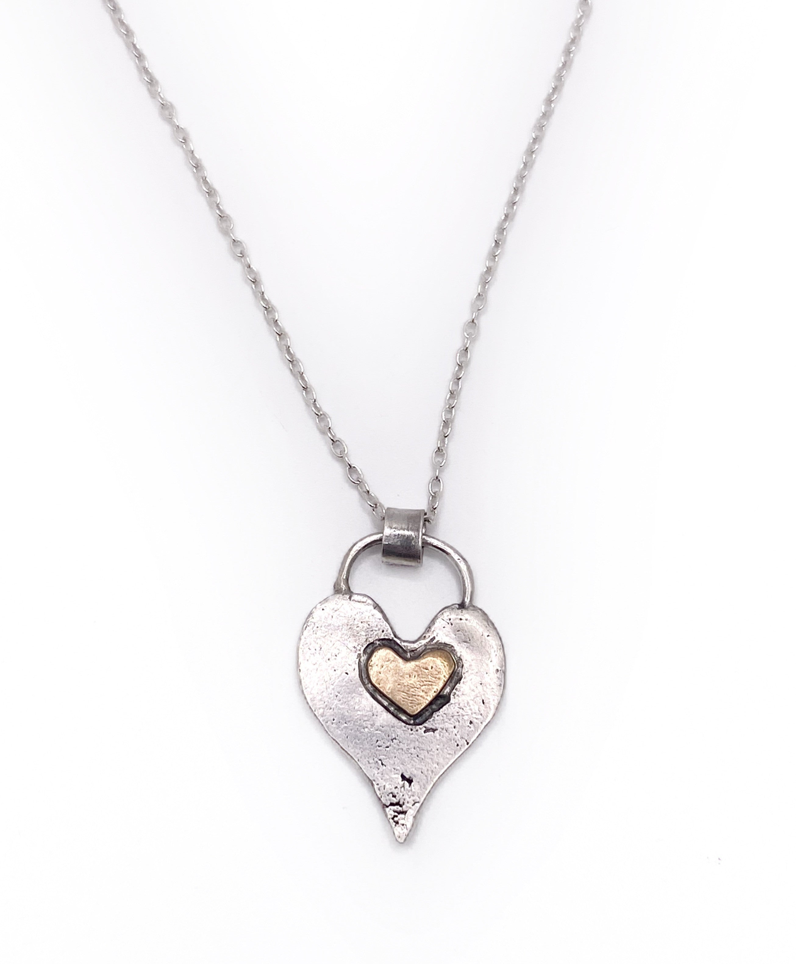 Fused recycled sterling silver heart medallion with small gold heart to contrast. Heart is about 1.25" and includes an 18 inch sterling silver chain.