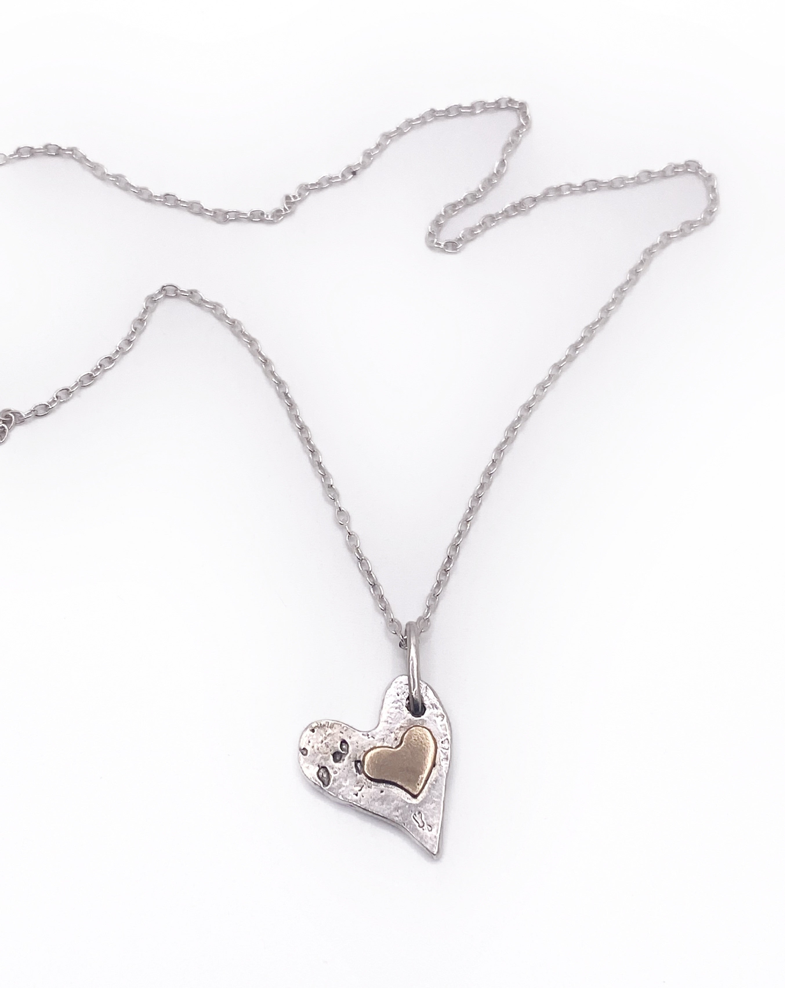 Offset recycled sterling silver heart medallion which hangs at a slight angle with contrasting 14k gold fill heart. Sold with an 18 inch sterling chain. Heart is about 1 inch.