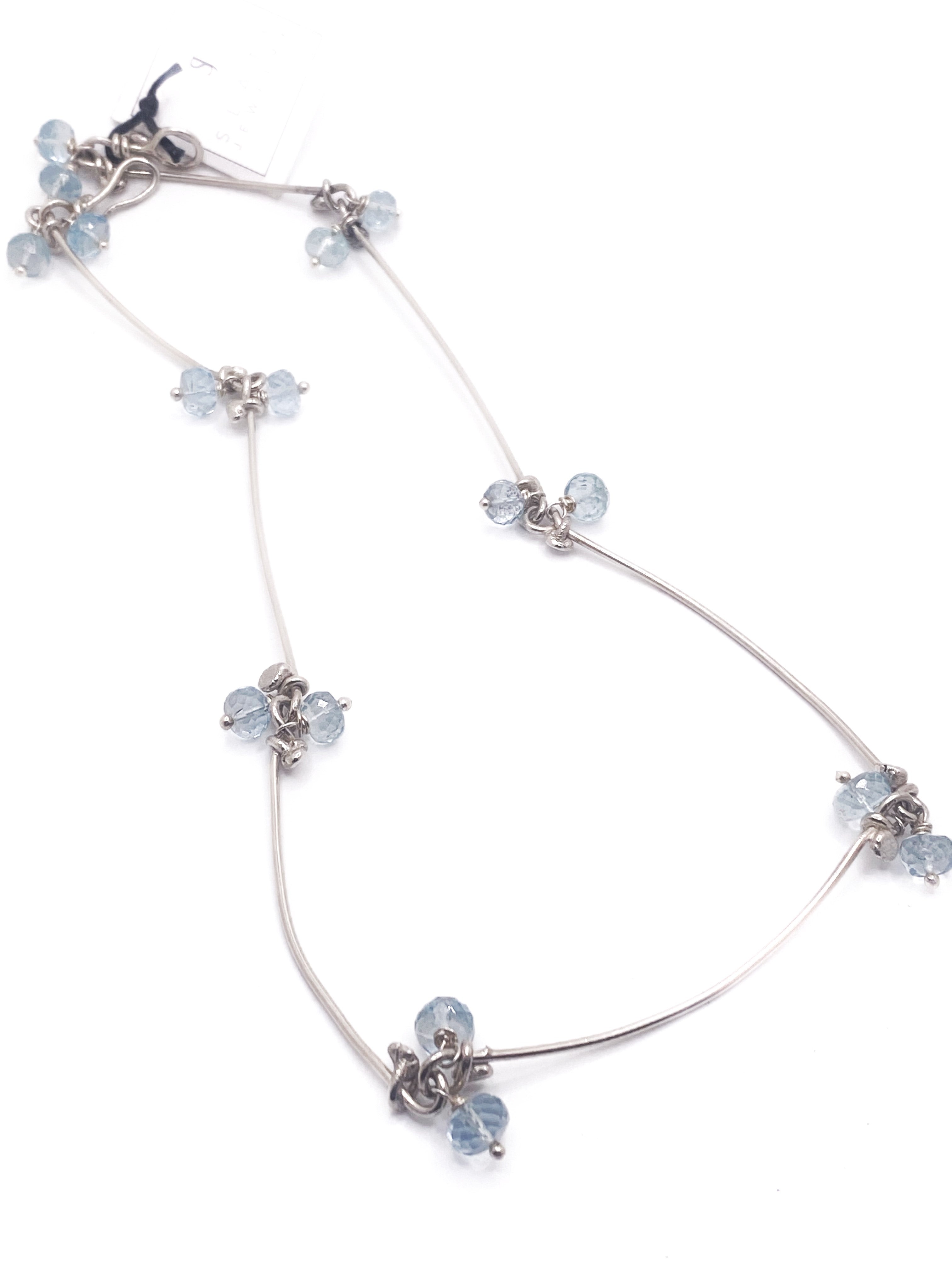 A delicate piece. Lovely for a bridal party. Pale blue aquamarines paired on sparse nailhead links done in 16 g sterling silver wire. Overall length is about 18 inches. This style can be done with other small pearls or gemstones to suit your wedding theme. Just message me for details or ideas.