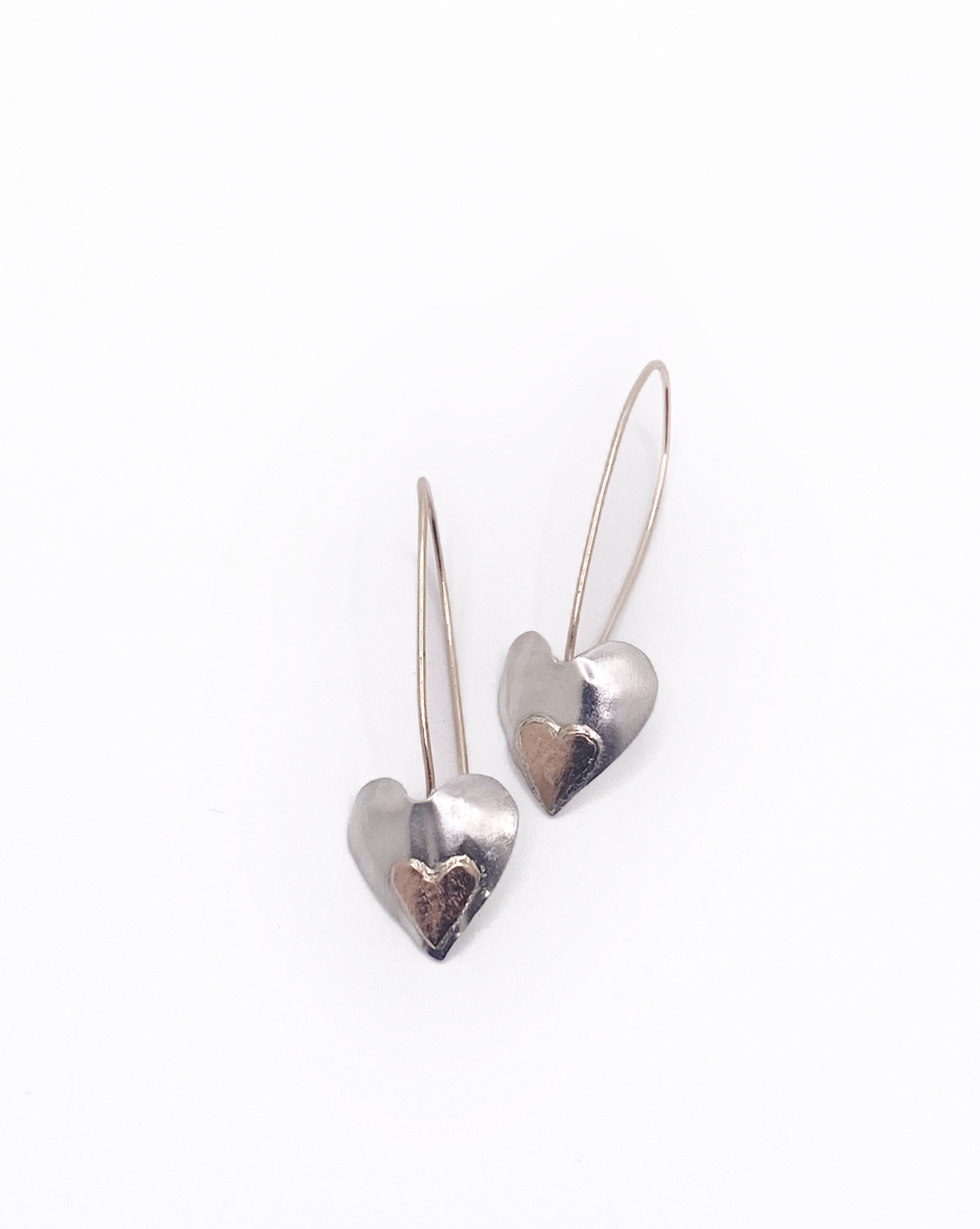 Very modern silhouette in sterling silver with 14 k gold fill earwires and accent heart. About 1.75 inches long. Hearts are slight folded to give dimension and add to the contemporary look.